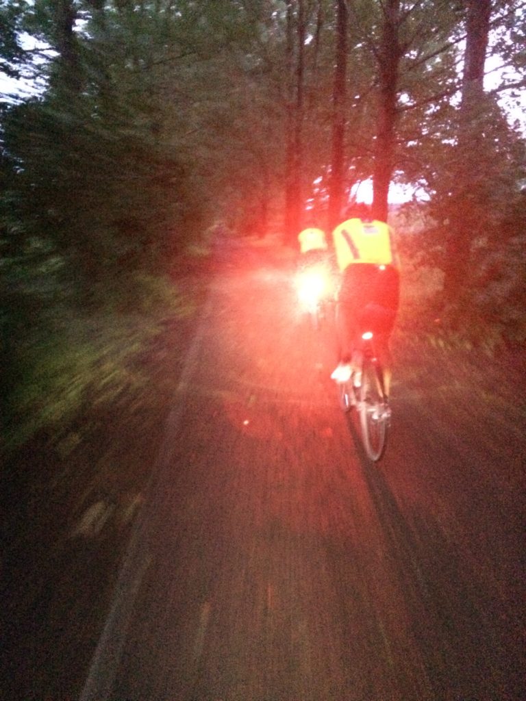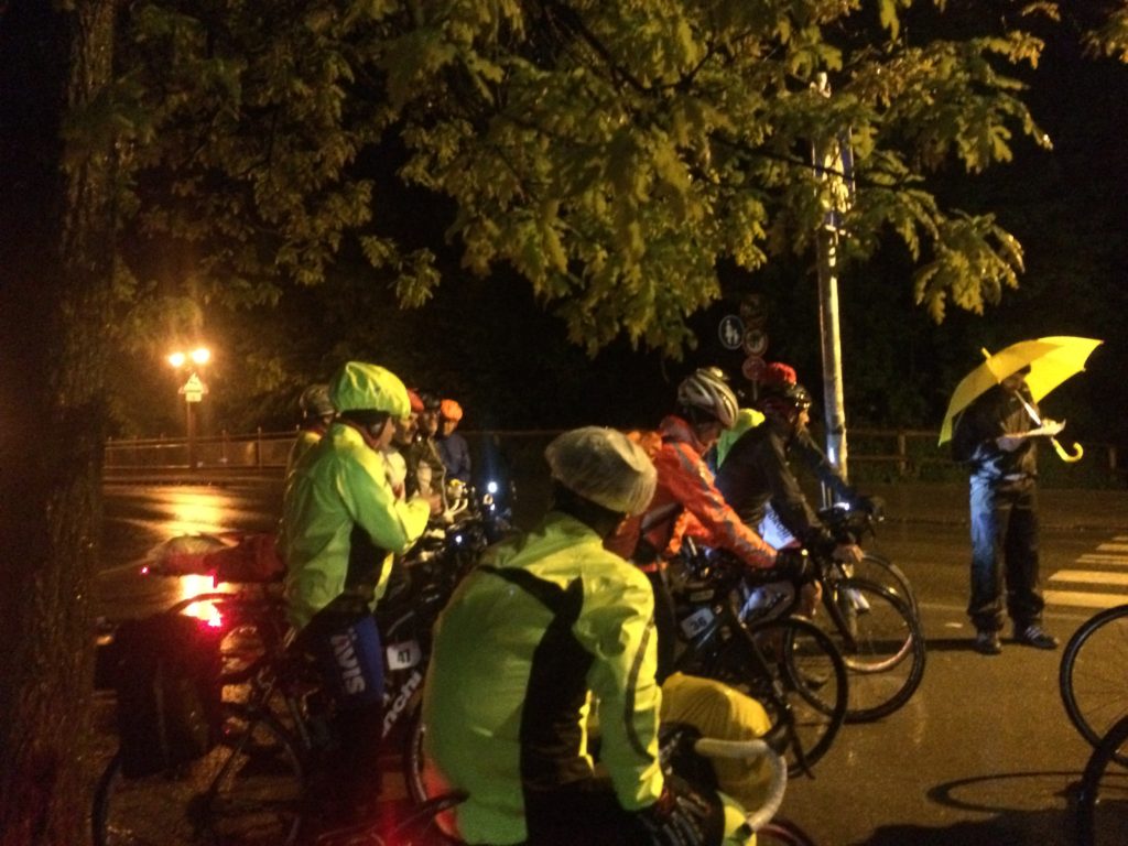 A colazione già si intravedevano un po’ di musi lunghi visto che la pioggia era decisa e non accennava a smettere. Come deciso Carlo, Pierre ed io alle 4 ci dirigiamo la partenza. Personalmente ero ben equipaggiato per far fronte a quel tempaccio; oltre a quello che indossavo avevo anche un cambio completo dalla testa ai piedi e 3 paia di guanti perciò non ero troppo preoccupato, almeno dal meteo.