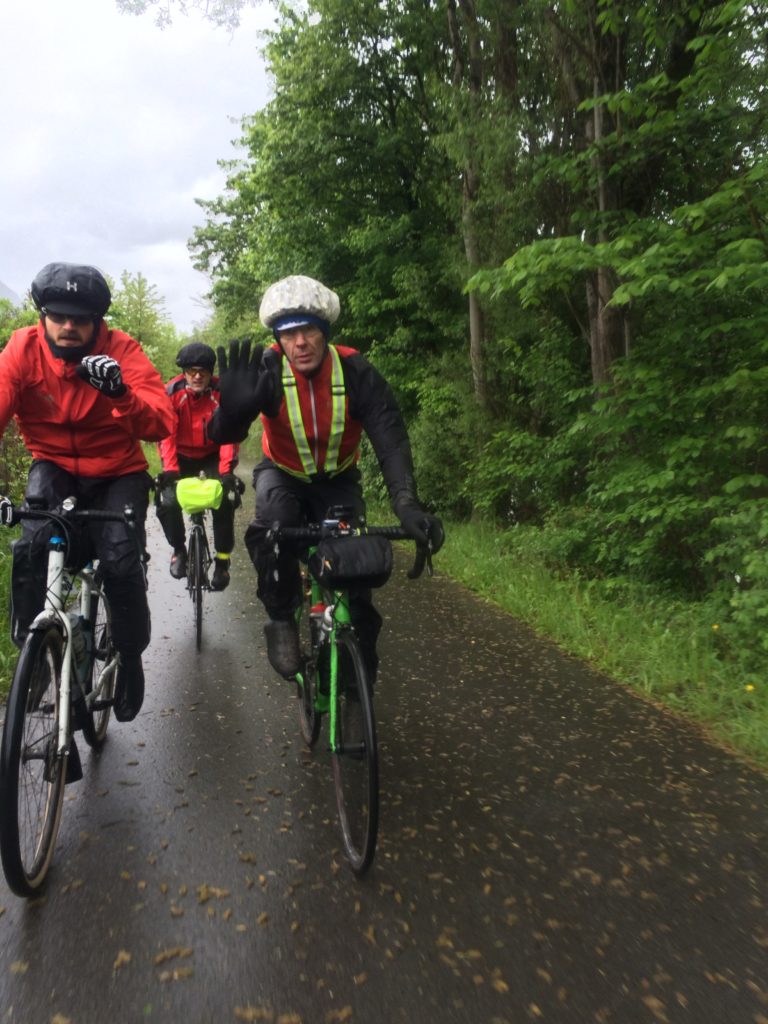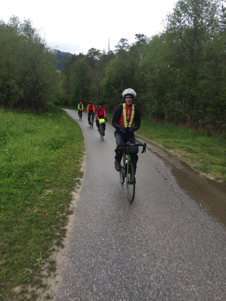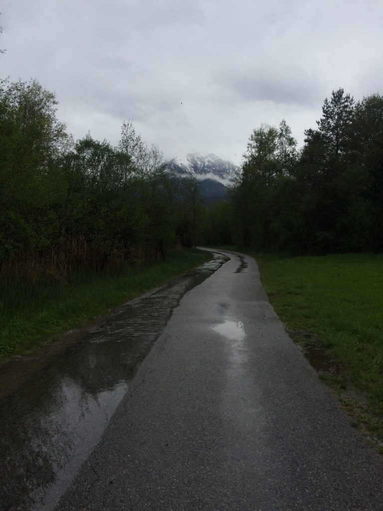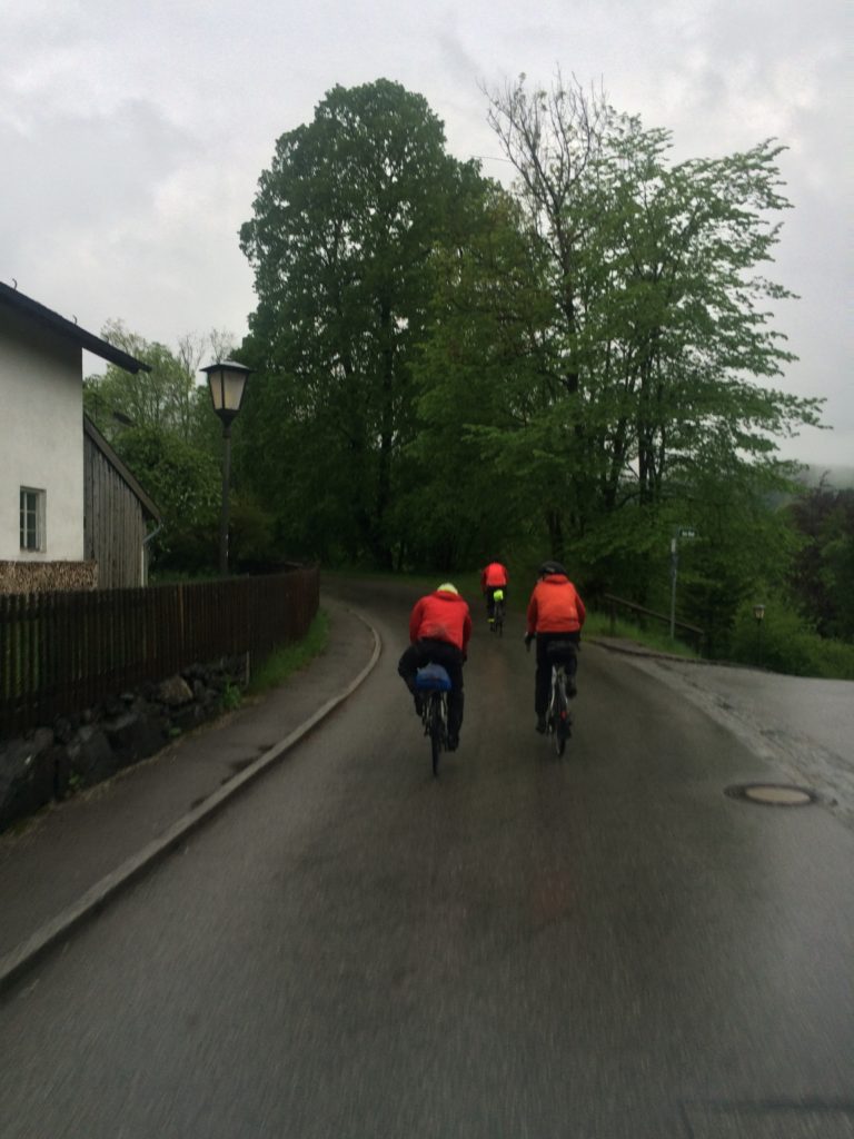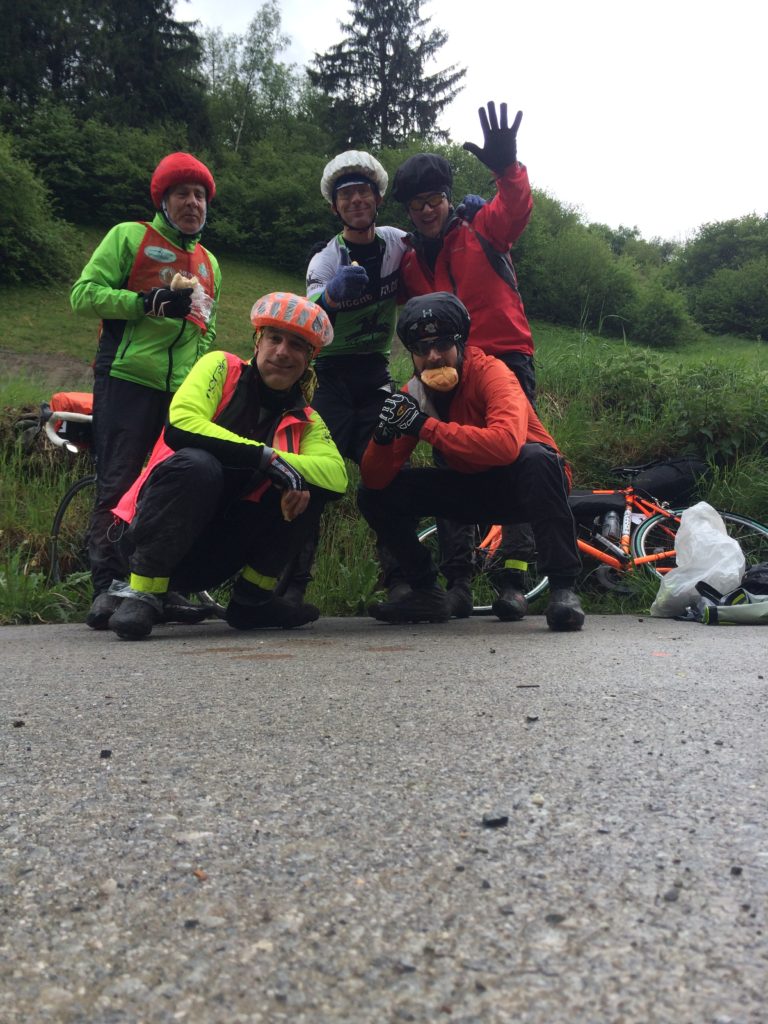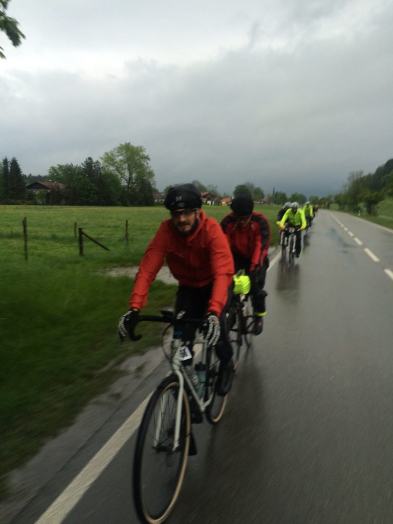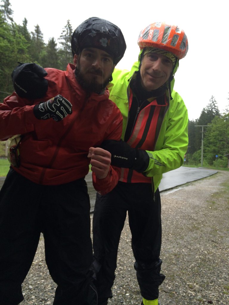 Alle 4:30 in punto partiamo riuscendo a rimanere insieme Carlo, Pierre e Francesco von Brixen (anch’egli amico solstiziale convinto) nonostante fosse difficile nello sterrato fradicio e buio. Dopo alcuni chilometri il gruppo si è naturalmente diluito e con l’alba lo stare insieme diviene più agevole e verso le 9, sotto una pioggia che voleva diventarci amica per la pelle, raggiungiamo a Garmish, primo punto di controllo e ristoro. Il morale era alto nonostante le condizioni, così lo abbiamo sfruttato il più possibile per procedere, ci aspettava la salita del Fernpass che insieme abbiamo deciso di affrontare in strada evitando le insidie dello sterrato difficile e quasi pericoloso, soprattutto la discesa fino a Nassereith!