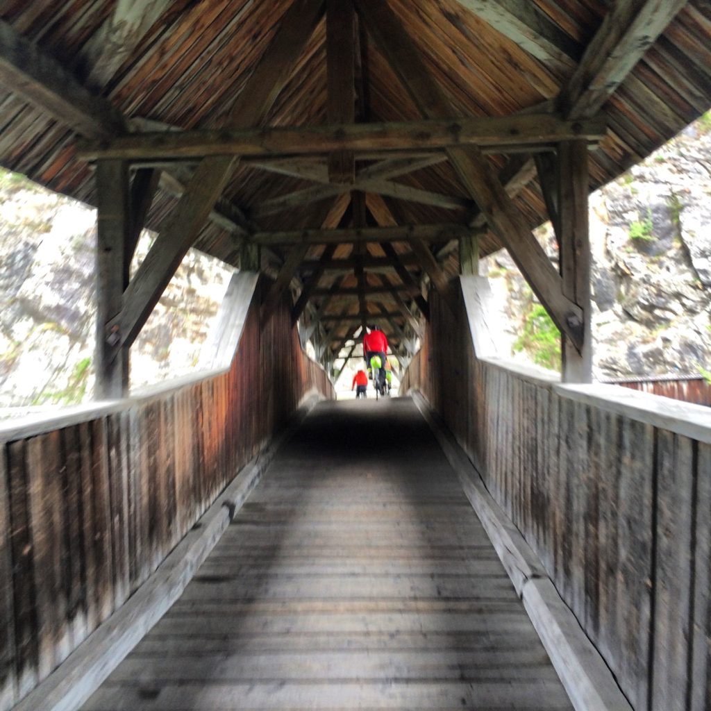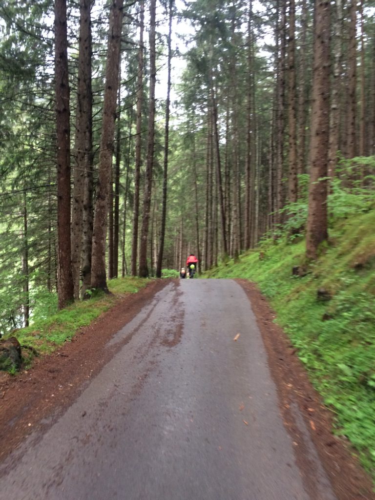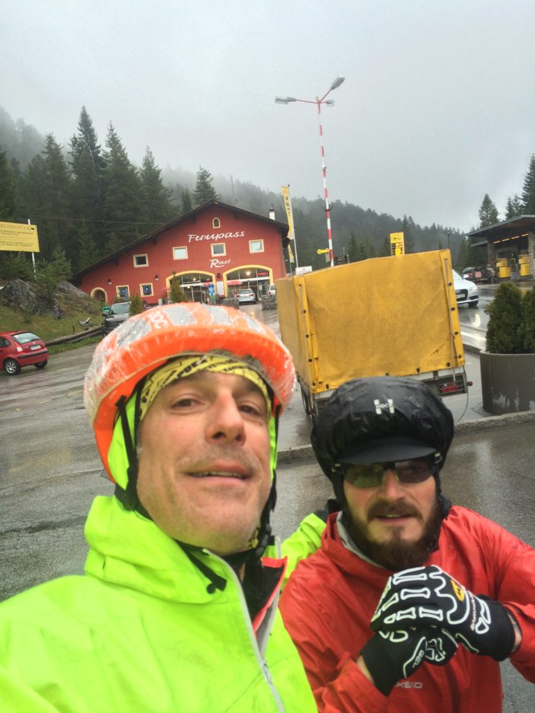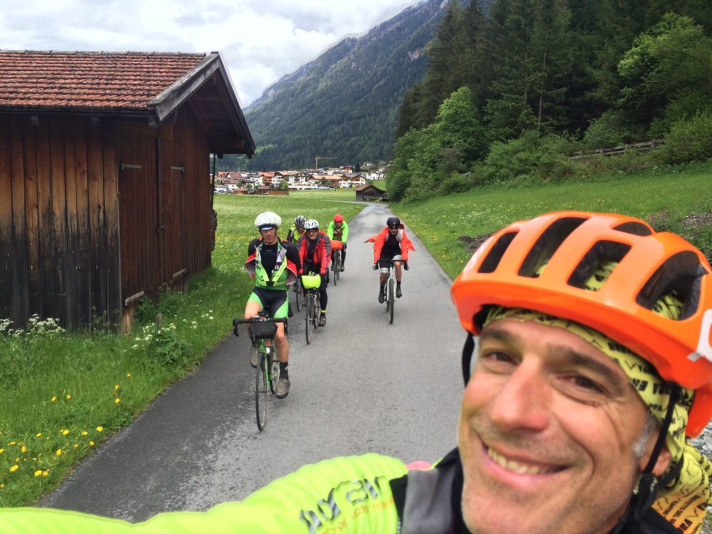 La salita al Fernpass ci fa pedalare insieme ma non molto loquaci, scambiandoci talvolta qualche battuta o imprecazione simpatica, ma ci arriviamo senza difficoltà. Al passo ci fermiamo per un minuto per coprirci meglio ed affrontare la discesa, difficile lunga e molto bagnata. A Nassereith siamo congelati e fradici con un nuovo compagno Gianluca che si aggiunge al nostro gruppetto. Che figo vedere formarsi questi gruppetti di persone che condividono lo stesso modo di andare in bicicletta, stando in silenzio anche per ore, ma pronti ad aiutarsi nel bisogno.