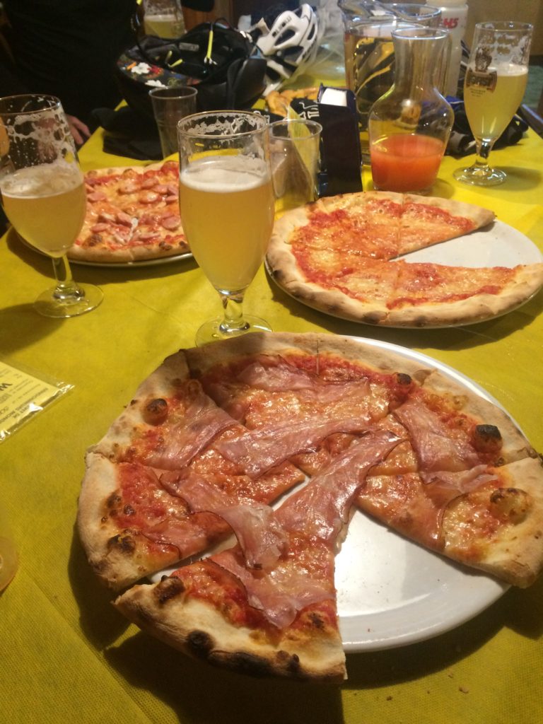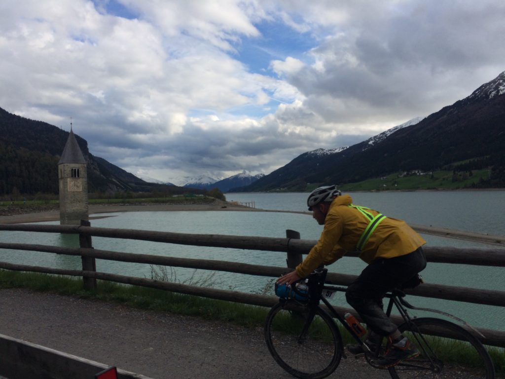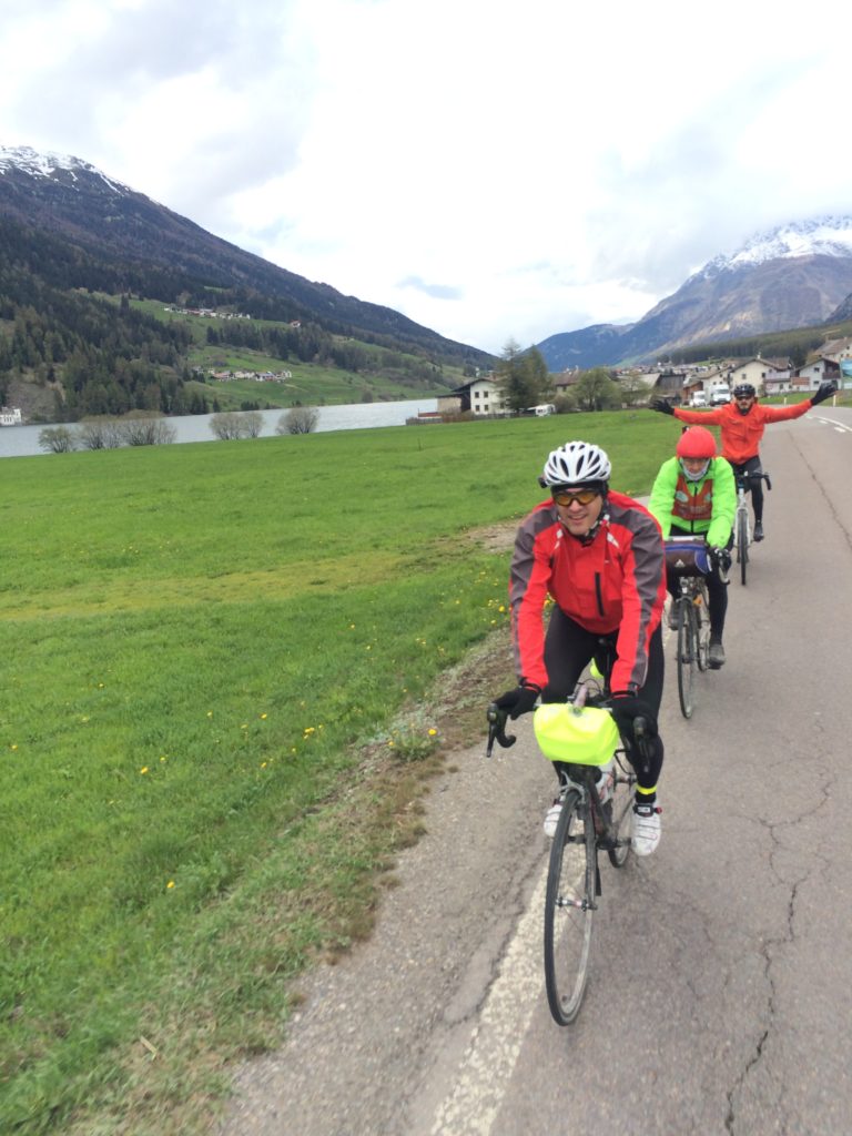 Ripartiamo presto un po’ rinfrancati, ci mancano oltre 100 km per arrivare al secondo controllo di Passo Resia e ritroviamo subito dopo con piacere Francesco che ci racconta di aver perso la via a Ehrwald (era un po’ avanti a noi ma senza navigatore) così continuiamo sotto questa pioggia tutti assieme. Incontriamo altri randagi tra cui Hermann e riusciamo anche ad avere una discreta andatura per un bel pò. Dopo circa 8 o 9 ore dalla partenza la pioggia pian piano lascia spazio a sprazzi di sole che poi si faranno più decisi accompagnandoci fino al Passo Resia, posto di controllo del chilometro 225 dove la pizza e la radler ci aspettano per ridarci spirito ed energia che, l’ultima salita da Martina in Svizzera a Nauders, ci aveva un po’ consumato. Dopo 1 h di stop ripartiamo in formazione consolidata Carlo, Francesco, Hermann e Gianluca ci aspettano oltre 100 km attraverso la ciclabile della Val Venosta fino a Bolzano dopo 340 km dove arriveremo poco prima delle 23 con una doppia foratura di Gianluca a 5 km da Bz