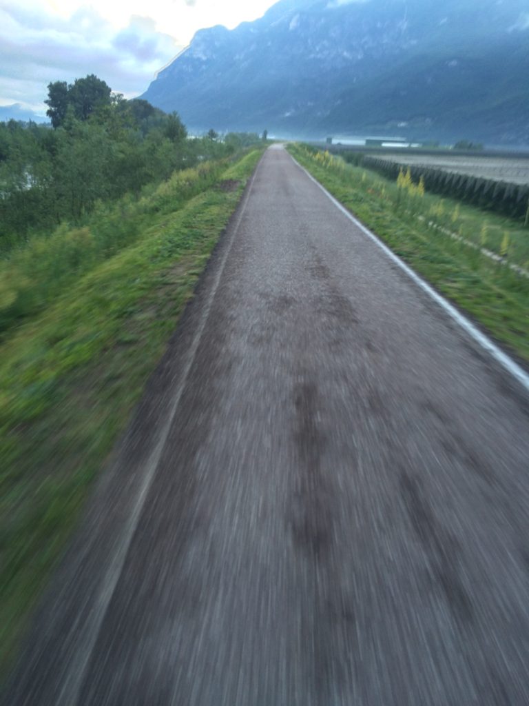 Parto in solitaria e ogni tanto incontro qualche altro randagio, chi più veloce chi più lento così arrivo solo soletto fino a Rovereto dove faccio colazione mentre nello stesso bar arriva un gruppo di ciclisti che fanno solo la tratta Bolzano Ferrara. Decido di ripartire con loro per sfruttare un po’ la scia ma sembrano punti da una tarantola e faccio fatica quindi dopo 5 km li saluto e continuo con il mio passo da solo.
